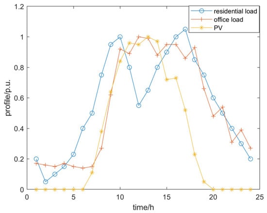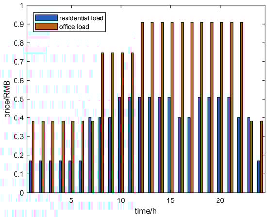 The network structure of this example system is depicted in Figure 4, where the green color represents intra-station tie switches, and the red color represents inter-station tie switches. The system includes 3 substations, 6 feeders, and 41 ring cages, with the rated voltage of 10 kV. Ring nodes 15, 18, 29, 32, 35, and 43 are connected to PV, and ring nodes 8, 17, 36, and 40 are connected to energy storage. Feeders F1 and F5 serve office loads, while feeders F2, F3, F4, and F6 serve residential loads. The typical load and solar profiles are depicted in Figure 5. The time-of-use tariff is illustrated in Figure 6. The cost of energy storage dispatch is 0.05 CNY/kW·h [18], the cost of flexible load unit power compensation is 0.06 CNY/kW·h [19], and the cost of switching actions is 200 CNY per operation [19].