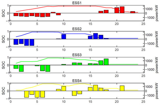 Equation (20) is the relationship between stored energy and the charging/discharging power of energy storage at time t. SESS,i(t) is the energy of energy storage at time t in ring node i. ηch and ηdis are the charging efficiency and discharging efficiency, respectively. Equation (21) is the capacity constraints of energy storage. CESS,max and CESS,min are the maximum and minimum state of charge, respectively. EESS,i is the rated capacity of energy storage in ring node i. Equation (22) is the discharging power and charging power constraints. PESS,i is the rated power of energy storage at ring node i. μdis(t) and μch(t) are the discharging and charging state in ring node i at time t, respectively. Equation (23) is the working state constraints. The three states are idle, charging, and discharging, and it can only be in one state in any moment. Equation (24) is the dispatch periodic constraints. Equations (25) and (26) are the charging and discharging times constraints, respectively. NESS(t) is a 0–1 variable that indicates the moment of the energy storage charge/discharge state change. is the limited charging times of energy storage in a day.