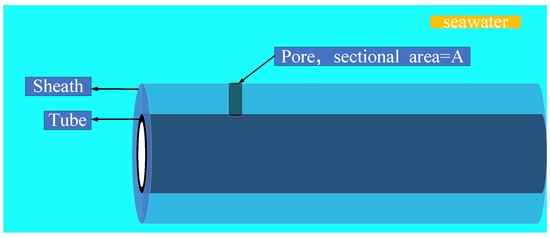 The internal structure of an umbilical cable is relatively complex. The transmission units mainly consist of power units, fiber optic units, oil transmission steel pipes, and chemical transmission steel pipes (hereinafter referred to as “steel pipes”), which enable energy transmission and remote onshore control. The protective structures include fillers and polymer jackets, ensuring the stability of the umbilical cable under stress conditions [6]. There is an electromagnetic induction phenomenon between the power units and the steel pipes of the umbilical cable, resulting in an induced voltage to ground (seawater) on the surface of the steel pipes. Under long-term seawater erosion conditions, the steel pipes are at risk of corrosion by alternating current, leading to perforation of the metal structure, which poses a significant threat to the stability of offshore power energy transmission systems [7,8]. Recent reports and research on steel pipe leakage failures both domestically and internationally indicate that AC electrochemical corrosion of the steel pipes inside an umbilical cable has become a major factor in umbilical cable failures. Figure 1 shows a schematic diagram of the holes produced in the steel pipes due to AC electrochemical corrosion [9,10,11,12].
