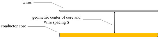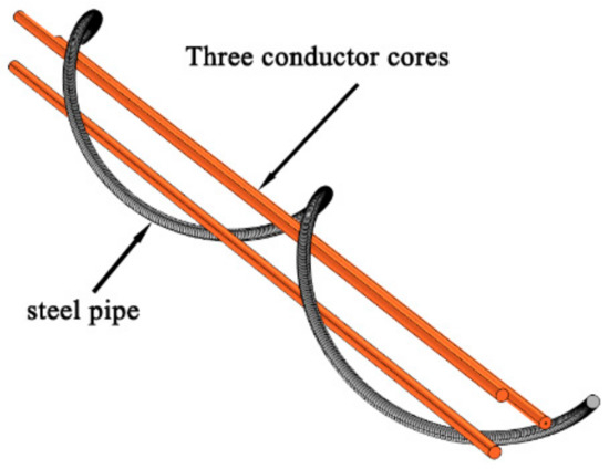 When the power conductor core was also twisted at a pitch of 333 mm, the length of the induced voltage to return to 0 no longer depended entirely on the spacing between the steel tube and the power conductor core, but it also depended on the pitch of the power conductor core. The conductor core and the steel tube were twisted under the conditions of the position schematic shown in Figure 8. In this case, the length cycle of the change in the induced potential occurring in the steel tube could be obtained only by considering the pitch length of the steel tube and the power conductor core at the same time. The induced potential change length cycle is also called the electromagnetic sense of the smallest repeat unit, and it can be understood as a high-voltage power unit and the steel tube from the initial relative position along the axial length of extension’ length to the initial relative position of the resumption of completion of a relative cycle of the stranded length of the unit. At this time, this is the voltage induced inside the steel tube to complete a cyclic change process.