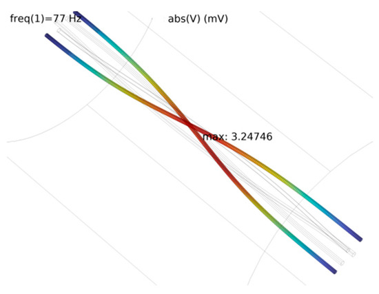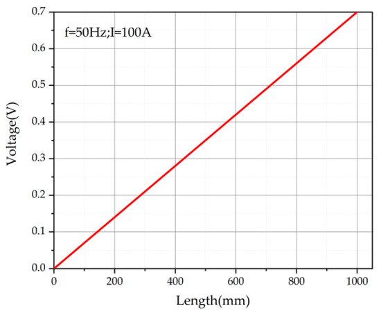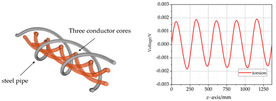 Figure 7 shows the relationship curve of the residual induced voltage on the surface of the steel tube along the axial direction of the cable when only the steel tube was twisted. It was found that when the steel tube was twisted, the residual induced voltage on its surface varied in a sinusoidal trend, which produced a periodic offset. In Figure 6, the peak induced voltage of 0.35 V existed on the surface of the steel tube at the positions 300 mm and 900 mm in the axial direction of the cable, while the induced voltage at positions of 0 mm, 600 mm, and 1200 mm on the steel tube had a value of 0 V. The above analysis could be used to determine that the length of 1200 mm was the stranded pitch of the steel tube, and the highest induced voltage value was found on the surface of the steel tube at positions of 300 mm and 900 mm under the length of the stranded pitch and the highest induced voltage value was at the positions of 0 mm, 600 mm, and 1200 mm, while at 0 mm, 600 mm, and 1200 mm, the induced voltage was completely canceled. This means that the residual induced voltage on the surface of the steel tube would be canceled out along the axial direction of the cable by the pitch cycle, and there would be no accumulation of induced voltage.