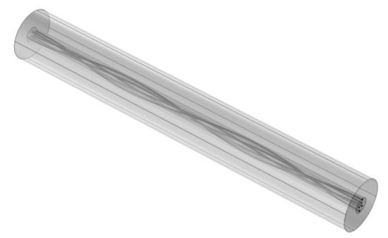 In this study, a three-core umbilical cable provided by Zhongtian Marine Cable Co., Ltd. was used as the research object. The 3D model of the three-core umbilical cable was constructed using Comsol Multiphysics finite element simulation software. Comsol Multiphysics, primarily based on the finite element method, is software which solves systems of partial differential equations to calculate coupled multiphysics phenomena. The version of Comsol Multiphysics finite element simulation software used in this study was Comsol 6.2. Due to the complex structure of the umbilical cable, this study mainly investigated the induced potential generated along the axial direction inside the steel pipe of the umbilical cable. Considering that the magnetic permeability of non-metallic structures is rather low, and some metallic structures inside the cable are less prone to AC electrochemical corrosion, non-metallic structures and certain metallic components, such as extruded GSW steel wire rope (1.8/3 kV power units), as well as optical fiber units could be appropriately omitted during the modeling process to save computational space and improve simulation efficiency and accuracy. The simplified 3D finite element simulation model constructed according to the above size requirements and model simplification is shown in Figure 9.