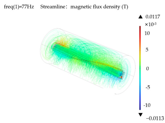 The AC electrochemical corrosion behavior of the metal structures inside the umbilical cable is significantly influenced by the induced potential generated by the alternating electric field. Experimental methods cannot provide detailed information on the axial macroscopic induced potential. Therefore, finite element simulation was used to calculate the induced potentials along the axis of the metal structures inside the umbilical cable. The AC voltage has a sinusoidal periodic waveform. The steel tube primarily experiences electromagnetic induction effects from the alternating electric field of the conductor cores, resulting in induced potentials. Finite element simulation enabled determination of the maximum induced potential values on the steel tube’s surface and their occurrence regions. This analysis helps assess the likelihood of AC electrochemical corrosion occurring in these areas. The magnetic field distribution generated by the conductor cores is illustrated in Figure 10.