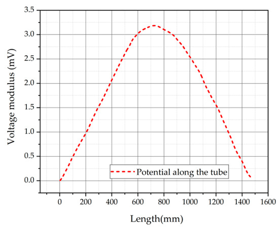 Based on the existing magnetic field distribution of the conductor cores, it was observed that the magnetic field exhibited a sinusoidal periodic distribution. Similarly, the induced potentials at the steel pipe exhibited the same characteristics. Through three-dimensional finite element simulation of the three-core umbilical cable, the induced potential distribution generated by the conductor cores in the steel pipe under the condition of the minimum repeating unit is shown in Figure 11, and the potential distribution curve along the axis of the steel pipe is depicted in Figure 12.