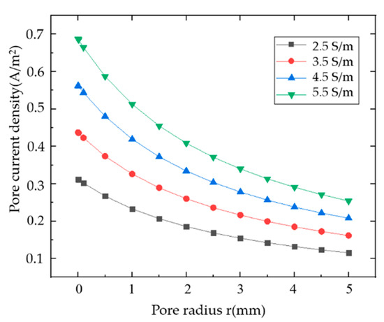 To obtain comprehensive results on the AC electrochemical corrosion behavior of the three-core umbilical cable studied in this paper, Equations (18) and (19) were combined to calculate the internal current density (in J) within pore radii ranging from 1 × 10−4 mm to 5 mm and seawater conductivities ranging from 2.5 S/m to 5.5 S/m. The variation in pore current density with the pore radius under different seawater conductivities is depicted in Figure 14.