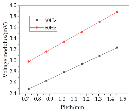 The induced current density in the steel pipe of the umbilical cable correlates positively with the induced voltage. Changes in the twisting configuration of the internal metal structures of a cable can impact the induced voltage in the steel pipe. Additionally, as the AC frequency increases, the corrosion potential offset and amplitude of fluctuation decrease, resulting in a reduction in the magnitude of the voltage induced in the steel pipe of an umbilical cable. Therefore, in this section, while assuming seawater conductivity of 2.5 S/m and an insulation pore radius of 1 × 10−4 mm for the steel tube, a finite element simulation was employed to calculate the induced voltages at frequencies of 50 Hz and 60 Hz within the range of minimum repeat units from 0.72 m to 1.44 m. This approach helped to determine the effects of the twisting pitch and AC frequency variations on the current density of the steel pipe of the umbilical cable. The variation curves for the voltage induced in the steel pipe under different twisting pitches are shown in Figure 15.