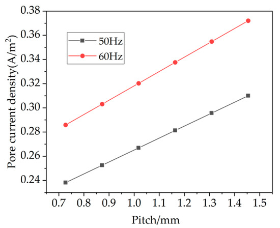 Figure 15 shows that the maximum induced voltage in the steel pipe was positively correlated with the cable pitch (i.e., the minimum repeating unit). When the minimum repeating unit was 0.72 m, the maximum induced voltage in the steel pipe was only 2.49 mV. As the minimum repeating unit increased to 1.44 m, the maximum induced voltage in the steel pipe increased to 3.24 mV. When the AC frequency increased from 50 Hz to 60 Hz, the maximum induced voltage in the steel pipe increased by approximately 1.2 times, proportional to the increase in the AC frequency. Based on the induced voltage values in the steel pipe shown in Figure 12, combined with Equation (17), the curve of the pore current density in the steel pipe at different pitches was calculated, and it is shown in Figure 16.