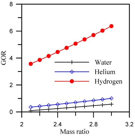 Figure 3 depicts the influence of mass ratio on GOR while utilizing various working fluids for a dehumidifier. The GOR is dependent on the condensation rate (see Equation (13)); hence, it follows the same trend as the condensation rate, and hydrogen and helium have higher GOR values than water. The average GOR value obtained when employing water, helium, and hydrogen as working fluids in a dehumidifier is 0.58, 1.01, and 6.37, respectively.