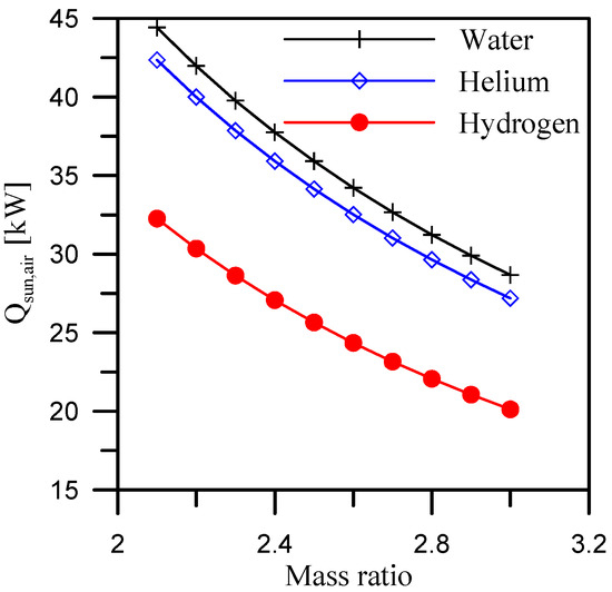 Figure 4 depicts the required heat for heating air from a solar air heater. This figure demonstrates how mass ratio affects air heating with various dehumidifier fluids. For all fluids in the dehumidifier, the air heater capacity decreases as mass ratio increases. Because of the low air flow, the air heating capacity reduces despite the fact that the air temperature differential through the air heater is large. The use of hydrogen requires the least amount of air heating, allowing for the use of a small solar collector and thus being less expensive than the other two dehumidifier coolants. The average solar air heat required when using hydrogen as a working fluid for dehumidifier is 28.6% and 24.9% lower than the average solar air heat when using water and helium as working fluids in the dehumidifier, respectively.