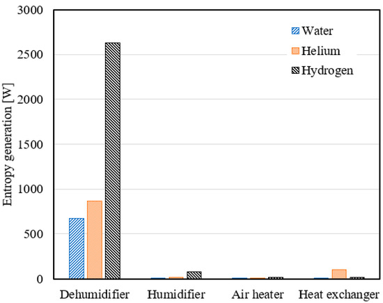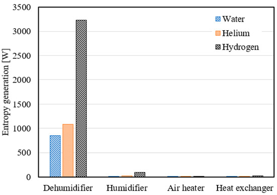 The entropy generation for each system component is shown in Figure 5. According to this figure, the air heater produces the least amount of entropy, while the dehumidifier generates the most. The largest entropy generation from a dehumidifier is 3231.8 W when hydrogen is used as a coolant in a dehumidifier.