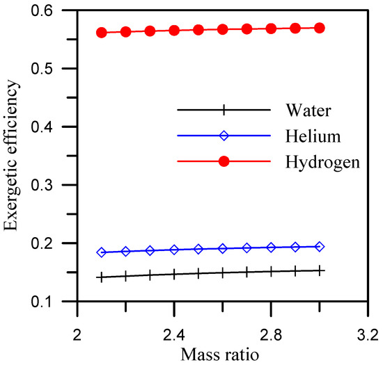 The effect of mass ratio and dehumidifier working fluids on entropy generation in the system is seen in Figure 6. The system generates the most entropy when the dehumidifier uses hydrogen, and the least when the dehumidifier uses water. The average entropy generation for the system utilizing hydrogen in the dehumidifier is 3.8 times and 2.9 times more than the average entropy generation for the systems using water and helium, respectively.
