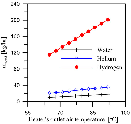 This section will present the impacts of the heater’s outlet air temperature on the system with a constant mass ratio of 10.2. The outlet air temperature range of the heater is 65 °C to 92 °C. Figure 8 depicts the relationship between condensation rate and the heater’s outlet air temperature when using different dehumidifier coolants. For the three dehumidifier coolants, the condensation rate increases as the heater’s outlet air temperature increases. This is due to sufficient cooling of the air in the dehumidifier when the air is high in temperature, resulting in a high condensation rate. However, the dehumidifier’s hydrogen coolant produces a high condensation rate. When hydrogen is used as a dehumidifier coolant instead of water and helium, the average condensation rate increases by 11.3 times and 5.6 times, respectively.