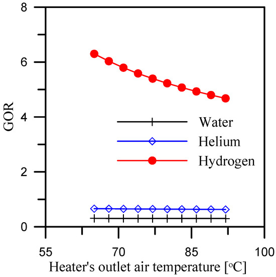 - When hydrogen is used as the coolant for the dehumidifier, the GOR is maximized. The average GOR across the heater outlet temperature range of 65 °C to 92 °C is 5.4, while it reaches 5.8 and 6.37, respectively, for air flow rate and mass ratio ranges of 0.4 to 0.7 kg/s and 2.1 to 3.