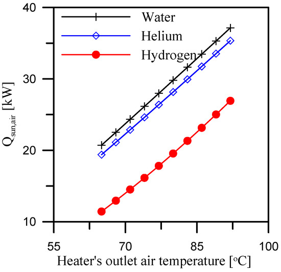 Figure 12 displays the system’s entropy generation as a function of the heater outlet air temperature. The entropy generated by the three dehumidifier coolants is proportional to the heater’s outlet air temperature. This is due to an increase in entropy generated by the dehumidifier. The system generates the most and the least entropy when hydrogen and water are used as coolants in the dehumidifier, respectively. When hydrogen is used as a coolant in the dehumidifier, the average entropy generation is 3 times and 3.9 times more than when helium and water are used.