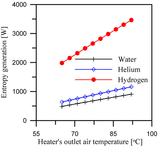 Figure 11 shows the average entropy generation over a range of heater outlet air temperatures. As illustrated, dehumidifiers have a greater effect on entropy generation than other system components. When the dehumidifier employs water, helium, and hydrogen as dehumidifier coolants, the average entropy generation is 670.9 W, 863.4 W, and 2626.9 W, respectively.
