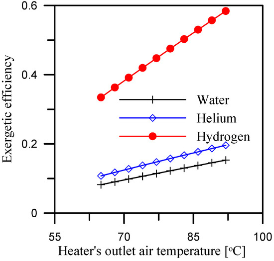 Figure 13 displays the exergetic efficiency of increasing the heater outlet air temperature. The exergetic efficiency increases as the heater outlet air temperature increases. This is due to the behavior of entropy generation. When hydrogen is used as coolant in the dehumidifier, the average exergetic efficiency is 0.46 over the heater outlet air temperature range.
