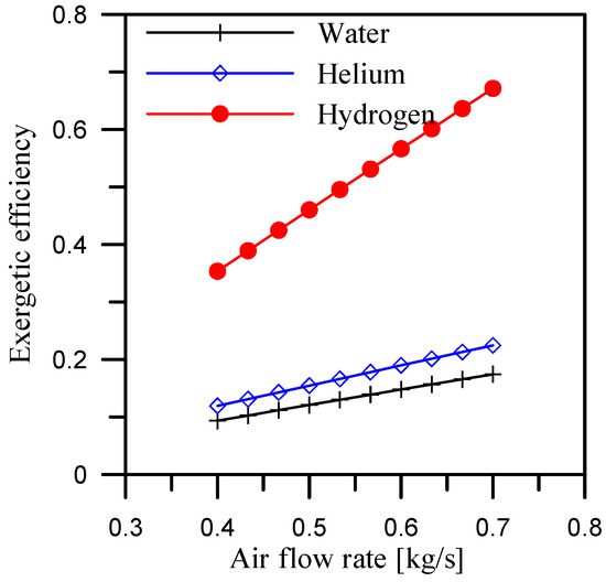 Figure 17 displays the average entropy generation for each system component with varying air flow rate and constant mass ratio. The humidifier generates less entropy than a dehumidifier. In addition, the air heater has the lowest entropy value. The dehumidifier generates 763.1 W, 974.3 W, and 2918.3 W of entropy when water, helium, and hydrogen are used as dehumidifier coolants, respectively. Figure 18 displays the entropy generation for a system with a variable air flow rate, a constant mass ratio of 2.5, and a constant heater outlet air temperature of 90 °C. When hydrogen, water, and helium are utilized as dehumidifier coolants, entropy generation increases with the rate of air flow. Furthermore, when hydrogen is employed as a coolant in a dehumidifier, the system produces the maximum entropy compared to water or helium, because the entropy generated by the dehumidifier has a greater impact on the system’s entropy generating trend. Thus, Figure 19 illustrates that when hydrogen is used as a coolant in the dehumidifier, the system has a high exergetic efficiency; it increases by 3.82 times and 2.98 times when compared to helium and water coolants.