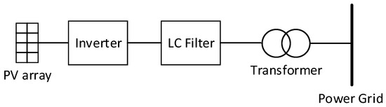 There are single-stage type and two-stage types of PV power generation systems, the former realizes the MPPT by a one-stage DC/AC session and connects the booster transformer [20,21]. As shown in the Figure 2. The photovoltaic effect converts solar energy into electrical energy, and the DC power collected by the panel is converted into AC power by the inverter, and then output by the filter and connected to the power grid.