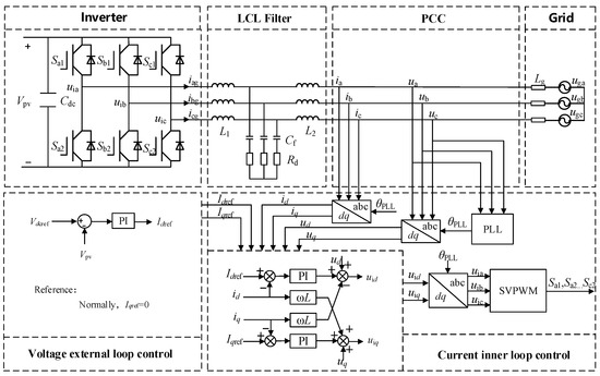 When the PV system operates normally, the inverter follows a double closed-loop control strategy [22]. Figure 3 shows the structure of the grid-connected PV system and the overall control process of the inverter. Firstly, collecting the three-phase voltage and three-phase current at PCC. The three-phase cross-flow at the PCC is changed to a direct flow in the dq rotating coordinate system, while the whole PV grid system is controlled by controlling the direct flow. Then there is the voltage external loop control module, which obtains the grid current d-axis and q-axis component references Idref and Iqref through the PI control and negative feedback. The DC voltage reference is determined by the maximum power tracking link of the PV array link. However, the q-axis current reference in normal operation is generally taken as 0. The d-axis and q-axis reference values of the grid-connected currents output from the external loop are introduced into the inner-loop control link of the fixed active current id and reactive current iq current to obtain the d-axis component and q-axis component reference values of the voltage. Finally, the reference values of three-phase AC voltage are obtained based on the Park inverse transform. The control signals of the switching tubes in the three-phase bridge inverter circuit are generated by SVPWM control [23,24]. These steps realize a closed-loop control of the whole PV grid system.