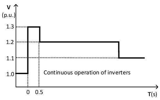 The specific requirements for high voltage ride-through in PV power plants are shown in Figure 5. The PV power plant is required to provide continuous active power regulation and the ability to inject reactive current into the grid during high voltage ride-through.
