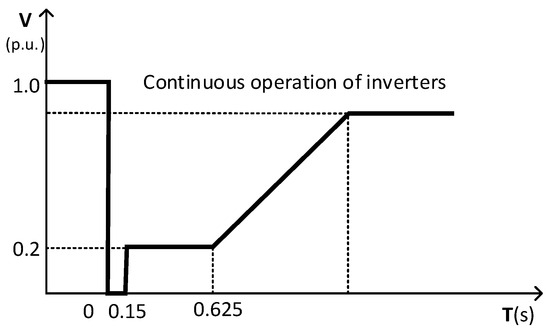 The specific requirements for low voltage ride-through in PV power plants are shown in Figure 6 [26]. It is required that the PV plants should be able to operate continuously without going off-grid for 0.15 s when the voltage at the grid-connected point of the PV plants drops to zero. The PV plants should also output reactive power to meet the voltage support of the system during voltage dips.