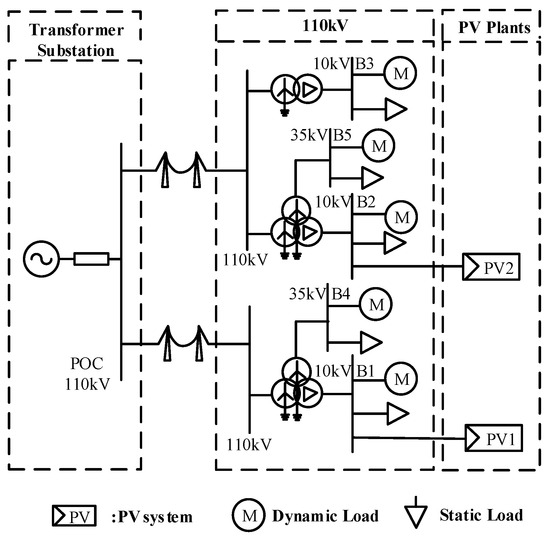 In order to obtain the key parameters of the generalized load model and parameter identification benchmark data, a detailed electromagnetic transient model of the distribution network containing distributed PV is established based on PSCAD as shown in Figure 8. In this case, the generalized load model accesses the 110 kV bus.