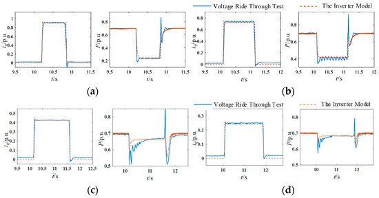 The inverter fault ride-through capability in the model is calibrated through simulation. The grid voltage drop amplitude is set to 80%, 60%, 40%, and 20% under 70% heavy load and symmetrical faults, respectively, and the LVRT faults form the grid voltage divider by casting the short circuit impedance. The reactive current and active output of the LVRT detection report and simulation model are shown in Figure 9. Under 80% heavy load and symmetrical faults, the amplitude of grid voltage rise is set to be 18% and 24%, respectively, and the high voltage ride-through fault raises the grid voltage by dropping the capacitor. The reactive current and active output of the high voltage ride-through detection report and simulation model are shown in Figure 10.