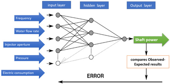 According to a study by the Harvard Business Review [1], more than 51% of the executives surveyed said they were using artificial intelligence (AI) to improve the quality of their products and 35% said they used it for decision making, which is still consistent today. Despite the fact that, in 2018, AI technologies and expertise were considered too expensive and there was a shortage of experts in the field, in addition to the lack of maturity that existed in those years, this has diminished over time. Today, there is capacity and research that points to a massification in the use of AI in different disciplines, including renewable energies [2,3]. Many hydroelectric plants in South America are decades old, and modernization is a priority for plant operators and grid operators. The need for modernization may include, among other things, improvements in the efficiency, capacity and safety of existing plants [4]. The application of machine learning for the estimation of critical variables, in conjunction with these enhancements, could result in improvements in their key performance indicators (KPIs). It is essential for the control of a Pelton turbine to have an accurate power estimate [5,6] and predictive maintenance of a micro-hydro power plant [7,8]. However, the traditional physical and statistical models are no longer able to meet the requirements of accuracy, flexibility, speed of construction and training that are demanded by the power plants [7]. There are studies, such as those conducted by Hamid et al. [9], where the estimation of micro-hydroelectric power plant production has been performed using artificial neural network techniques, proving to be effective in forecasting hydroelectric power production under different climate scenarios. Flores et al. [10] present a neural network model to optimize the geometry of hydro turbine blades, utilizing the Levenberg–Marquardt learning algorithm, which successfully predicts efficiency with high accuracy. Arnone’s work [11] demonstrates the use of artificial neural networks (ANN) combined with computational fluid dynamics (CFD) to predict the efficiency of a horizontal axis Kaplan turbine, although further validation is suggested to ensure the method’s reliability in various scenarios. Yildirim et al. [12] also employ neural networks to predict the performance of micro-hydroelectric power plants. Additional research has explored the application of neural network learning models: Liu et al. [13] propose a Bayesian–Gaussian neural network model to enhance the online prediction capability of hydro turbine systems for control applications in non-linear dynamic systems. Borkowski et al. [14] propose a control system, supported by a neural network and Maximum Power Efficiency Tracking (MEPT) algorithm, to improve the efficiency of variable-speed hydroelectric plants. Ferrero et al. [15] conclude that artificial neural networks (ANNs) applied to hydraulic studies are effective in simulating non-linear behaviors and dynamically predicting water flow, thereby improving accuracy in power production and maintenance. Tan et al. [16] utilize a hybrid algorithm based on social engineering theory and artificial neural networks for fault detection in hydraulic turbines, which is crucial for maintaining the efficiency of hydraulic turbines. Presas et al. [17] investigate the feasibility of predicting dynamic stress in Francis turbines using neural networks (NNs) and stationary sensors, thereby improving predictive maintenance and operational efficiency. Huang et al. [18] present a power prediction model for hydraulic turbines using machine learning, combining gray wolf optimization and support vector machines, achieving good accuracy. Rossi et al. [19] present a general methodology to predict the performance of pumps used as turbines (PATs) using artificial neural networks (ANNs), and the works of Telikani et al. [20] and Yu et al. [21] incorporate artificial neural networks (ANNs) to improve the prediction of pump-as-turbine (PaT) performance. Other research in turbomachinery includes work with neural network models to predict the performance of hydraulic pumps [22] and wind turbines using experimental data from the wind field [23]. Shin et al. [24] review the use of neural networks (NNs) to improve wind energy efficiency, concluding that NNs are effective tools for enhancing efficiency. Finally, it is worth mentioning that current works predict surface hydrocarbons using ensemble neural networks (ENNs) [25] and apply short-term load forecasting to a case study [26], among others.