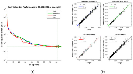 (a) ANN training performance. (b) Regression training, validation and test using the Leverbeng–Marquardt training algorithm.