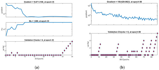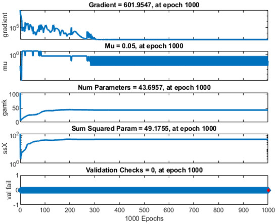 On the other hand, the L–M algorithm showed a low and stable gradient from about epoch 13 onwards. However, for the SGC algorithm, this gradient drop was not very stable, which can also be seen in the failed values of the SGC algorithm (see Figure 7). Finally, although the Bayesian algorithm is more computationally intensive, requiring 999 epochs to obtain a model, it has a failure rate close to zero, indicating that it would perform well earlier (see Figure 8).