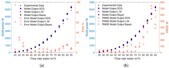 Figure 9a shows the graph of the shaft power at the turbine outlet. Although the three algorithms used seem to perform well in estimating the shaft power, when analyzing the absolute error, which considers the experimental data as real, it is observed that in the section where a flow rate of 25–35 /h is applied, the three training algorithms obtain an error higher than 6%. This means that good results are not obtained when estimating with low shaft power. However, in this range, we can see that the models present a low RMSE, generally below 100 W.