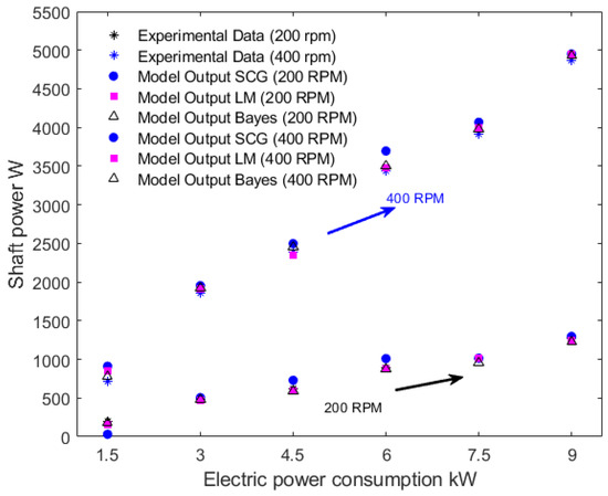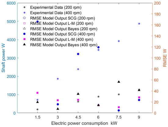Figure 12 shows experimental data and ANN model predictions (SCG, L–M, Bayesian) for shaft power at two speeds (200 and 400 rpm) as a function of power consumption (kW). At low speeds (200 rpm), the models present a low RMSE, indicating accurate predictions. At 400 rpm, although the RMSE increases, reflecting a larger deviation in the predictions, a significant increase in shaft power is also observed. The average RMSE values for the models are SCG: 269.5690 W, L–M: 240.2572 W, and Bayesian: 252.7586 W, while the coefficients of determination () are SCG: 0.9768, L–M: 0.9816, and Bayesian: 0.9796. Among the models, the performance in terms of the RMSE and fit is best for the L–M model, followed by the Bayesian and SCG algorithms. Experimental data show an increase in shaft power with increasing power consumption, consistent with model predictions, although with greater variations at 400 rpm. In conclusion, the ANN models are accurate at low-load and -speed conditions but need to be improved at high loads and speeds to reduce prediction error, with the L–M model showing the best overall performance.