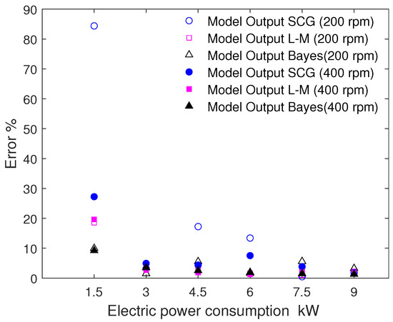 In Figure 10, we can see that the graph with the L–M and Bayesian estimation algorithms still has a clear trend in relation to the behavior of the graph with the experimental data, both for low speeds (200 rpm) and for high speeds (400 rpm) of the turbine shaft’s rotations. Using the L–M and Bayesian training algorithms gives better power estimation. Figure 11 shows that the highest error in power estimation at the turbine shaft was at an electrical load of 1.5 Kw. For the other electrical power consumption values, the error was considerably lower. As in the previous case, the lowest error was obtained with the L–M and Bayesian models, with minimum error results ranging from 0.46 to 1.83% and maximum values ranging from 1.9 to 4.5 %. In general, the best estimation performance was obtained with the L–M algorithm, which was slightly better than the estimates obtained with the Bayesian training model. On the other hand, and as in the previous case, the SGC algorithm had the highest errors in estimating the experimental turbine power data.