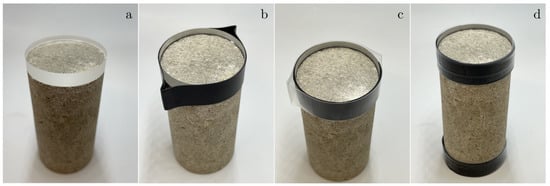 Preparation of a core plug for spontaneous imbibition experiment: (a) Masking the core plug face with a glass disc. (b) Fixing the glass disc with a heat-shrinkable Viton band. (c) Fixing a heat-shrinkable Teflon band above the Viton band. (d) The core plug with masked top and bottom faces.