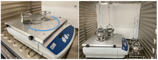 Spontaneous imbibition experiment with continuous shaking of the Amott cells: (a) A VWR Advanced orbital shaker with the orbit diameter of 19 mm. (b) The Amott cells with core plugs mounted on the shaker platform. For comparison, similar core plugs were tested at static conditions (the right two cells in the photo).