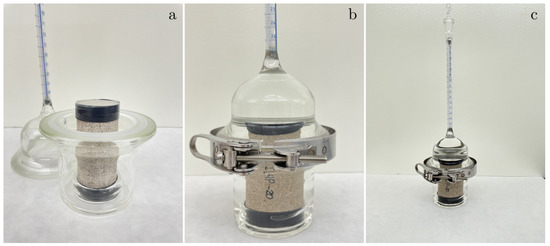 Custom-made Amott cell: (a) Positioning a core sample into the glass seat. This modification ensures sample lateral stability during shaking. (b) Assembling two flanges of the cell with a clamp. (c) Full view of the modified Amott cell.