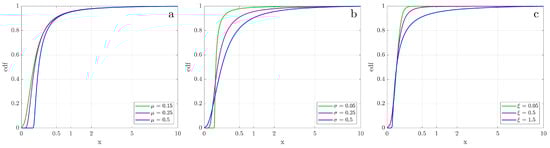 The GEV for different location, scale, and shape parameters settings: (a) Varying ; = 0.25 and = 1. (b) Varying ; = 0.25 and = 1. (c) Varying ; = 0.25 and = 0.25.
