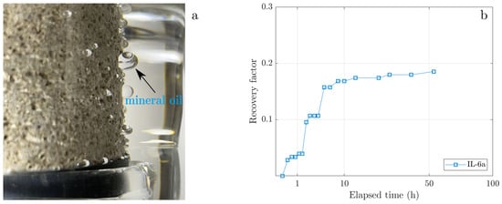 Oil production was recorded through visual observation. To improve the accuracy of oil-production measurements, we chose a burette with a high resolution of 0.05 mL for Amott cell manufacturing. The measurements were taken at short intervals, typically every 10–15 min during the initial hours, then every 30–60 min for the subsequent hours, and finally every 2–3 h after the production rate began to decline. At these experimental settings, the minimal increment of oil production represented 0.6% (0.006 fraction) of the oil recovery factor for typical core sample saturations of 9 mL. As will be demonstrated in Section 3, the frequency of oil-production measurements falls closely within 0.6% increment. Therefore, we assert that within the volumetric measurement error, our results are unaffected by the measurement delay. The total duration of all experiments varied depending on the experimental conditions, and the experiments were stopped when no oil production was recorded for 24 h.