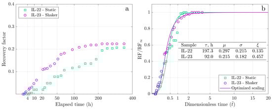 Spontaneous imbibition dynamics for the twin pair IL-22/IL-23: (a) Experimental cumulative recovery versus the square root of time. (b) Scaled cumulative recovery versus the square root of dimensionless time.
