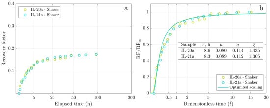 Next, we examined the influence of oil viscosity on the GEV-fitting parameters through the interdependent Amott tests on the core twin pair IL-20a/IL-21a, which originates from the same core source as the twin pair IL-22/IL-23 (refer to Section 2). Figure 7 presents the spontaneous imbibition and GEV modeling results for IL-20a/IL-21a, saturated with the low-viscosity Oil-1. Both tests were performed using the modified Amott methodology. As shown in Figure 7a, these modifications resulted in the remarkably consistent oil production histories. Both recovery curves are smooth and nearly replicate each other, underscoring the excellent reproducibility of oil recovery in parallel experiments.