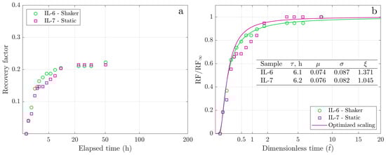 Spontaneous imbibition dynamics for the twin pair IL-6/IL-7: (a) Experimental cumulative recovery versus the square root of time. (b) Scaled cumulative recovery versus the square root of dimensionless time.