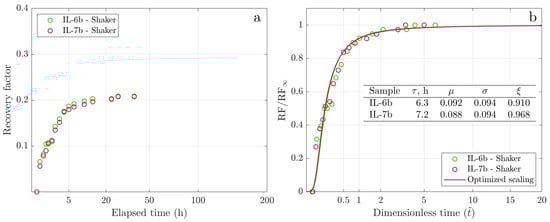 Spontaneous imbibition dynamics for the twin pair IL-6b/IL-7b: (a) Experimental cumulative recovery versus the square root of time. (b) Scaled cumulative recovery versus the square root of dimensionless time.