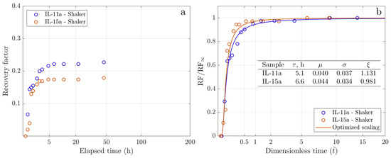 Spontaneous imbibition dynamics for the twin pair IL-11a/IL-15a: (a) Experimental cumulative recovery versus the square root of time. (b) Scaled cumulative recovery versus the square root of dimensionless time.