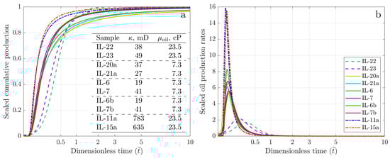 We further explored spontaneous imbibition for the core twin pair IL-11a/IL-15a characterized by an order of magnitude greater permeability (see Table 1). Figure 10a presents the experimental findings for this core plug set, which was saturated with the high-viscosity Oil-2. Both tests were conducted using dynamic conditions. The early phase of the recovery process is notably fast, highlighted by a rapid increase of cumulative production. The delay in the production onset is minimal. For sample IL-11a, the transition from the quick early recovery to the slower late-time dynamics reflects a minimal oil holdup effect. The decrease in production rate during the later stages is also rapid, reaching a plateau in just 5 h, which is faster than in any other all experiments discussed previously. The notable difference in ultimate recovery between these core plugs can be attributed to their different pore structures, because they originated from different cores.