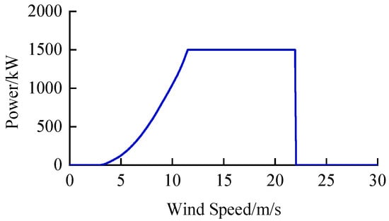 where ρ is the density of air; is the coefficient of the utilization of wind energy; λ is the tip speed ratio; β is the pitch angle of the wind turbine; R is the radius of the wind turbine blade; and is wind speed. This paper uses the permanent magnet synchronous generator (PMSG), which has the merit of a simple structure and high efficiency. Table 2 shows the parameter of the wind power generation system. In practical work, the output power of wind turbines does not increase continuously with the increase in wind speed. Figure 3 shows the power–wind speed diagram of the generator.