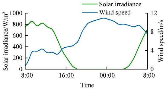 The solar irradiance and wind speed data (shown in Figure 4) in this paper are sourced from observation data from meteorological stations on the same day and in the same region of port ship data statistics. These data are the average values recorded by meteorological stations every 30 min. Then, the data at all times are obtained through linear interpolation.