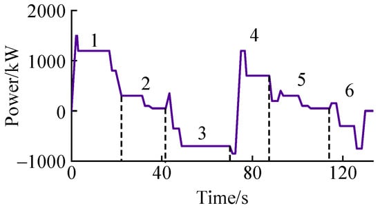 The power curve of a craning cycle of a quay crane (parameters are shown in Table 9 [35]) is shown in Figure 6.