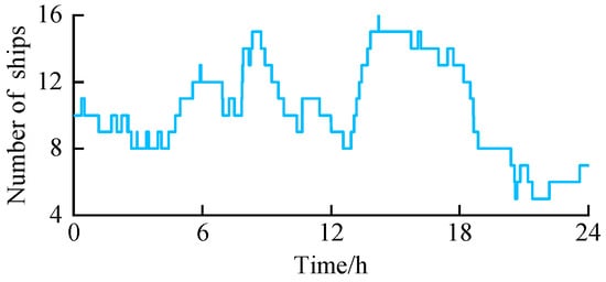 In addition to ships, quay cranes, and yard cranes, port loads also include refrigerated containers and lighting electricity, but they belong to stable loads and do not affect the research on fluctuating loads in this paper. This paper surveys the ship data (Table 10 and Figure 7) of the Shanghai Hudong container terminal in one day, and combines this with the data of the ship shore power (Table 11 [36]) and Equation (21) to obtain the power curve of the port (Figure 8). It is obvious that the port load has large fluctuations and changes fast.