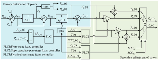 In the green port multi-energy microgrid system, the output power of renewable energy generation systems is uncertain, and the port load has the characteristics of a high peak value, frequent fluctuations, and strong periodicity. These fluctuations of power can easily lead to the problem of the charge of state exceeding the limit of the energy storage system, and affect the efficiency and lifespan of the hybrid energy storage system. Therefore, it is necessary to allocate the fluctuating power of the system reasonably and to control the SOC of the energy storage system. Refs. [16,17] propose using a fixed time constant LPF to decompose the fluctuating power of renewable energy generation systems, but it cannot cope with changing working scenarios and cannot fully leverage the advantages of hybrid energy storage systems. Ref. [20] proposes a rule-based energy management strategy. Although it can maintain the SOC of the energy storage system within a safe range, it may control the system to exit the operation, thereby reducing system stability. Ref. [28] proposes using a fuzzy controller output power adjustment coefficient to solve the problem of the SOC exceeding the limit in energy storage systems based on the SOC and SOC variables of the energy storage system. However, it may bring additional high-frequency power fluctuations due to the inaccurate power adjustment coefficient. The work of Ref. [29] proposes an energy management strategy based on a Type-2 fuzzy controller to solve the problems of an unstable power grid and the increased operating costs of hybrid microgrid energy systems, which are due to the inconsistent charging of electric vehicles and fluctuations in renewable energy output. However, the aspect it lacks consideration of is that the battery is unable to systematically cope with high-frequency fluctuations within the system. Ref. [30] proposes an energy management strategy based on double-layer fuzzy logic control to reduce the life loss of a high-speed railway hybrid energy storage system, but it does not take into account the frequency characteristics of the power absorbed by different energy storage devices. To address these issues, an EMS based on two-stage fuzzy control is put forward, and its main contributions include the following: