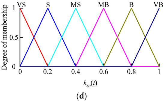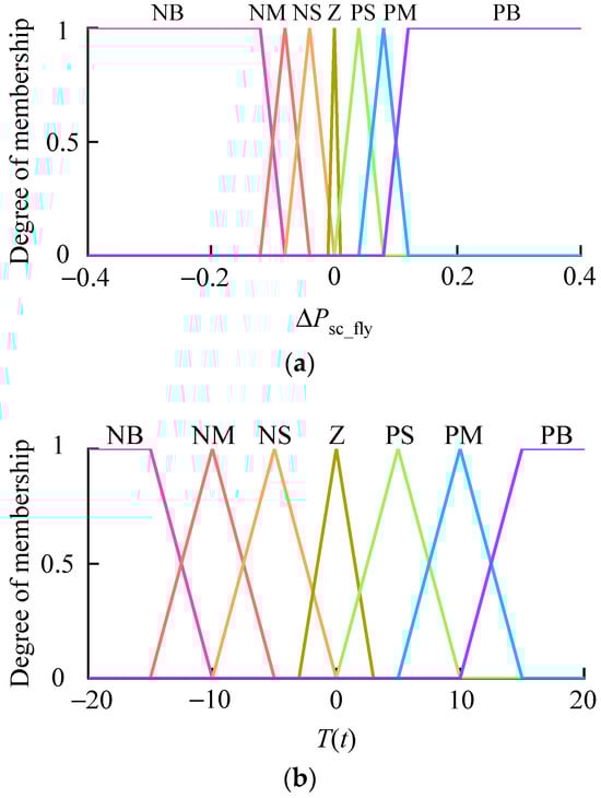The function of the front-stage fuzzy controller (FSFC) is to adjust the time constant of the LPF based on the change in power, which can reasonably distribute fluctuating power and improve the efficiency of the hybrid energy storage system. The principle of FSFC is increasing the time constant of the LPF when the fluctuation of power is large, and decreasing the time constant of the LPF when it becomes smooth. Therefore, the FSFC inputs the change in the power of the supercapacitor and flywheel in () and outputs the time constant (T(t)) of the second LPF. Negative big (NB), negative middle (NM), negative small (NS), zero (Z), positive small (PS), positive middle (PM), and positive big (PB) are selected as fuzzy sets to describe the . The range of is obtained by dividing its peak value by the quantization factor. The quantification factor is 106 in this paper, and the range of is [−0.4, 0.4].
